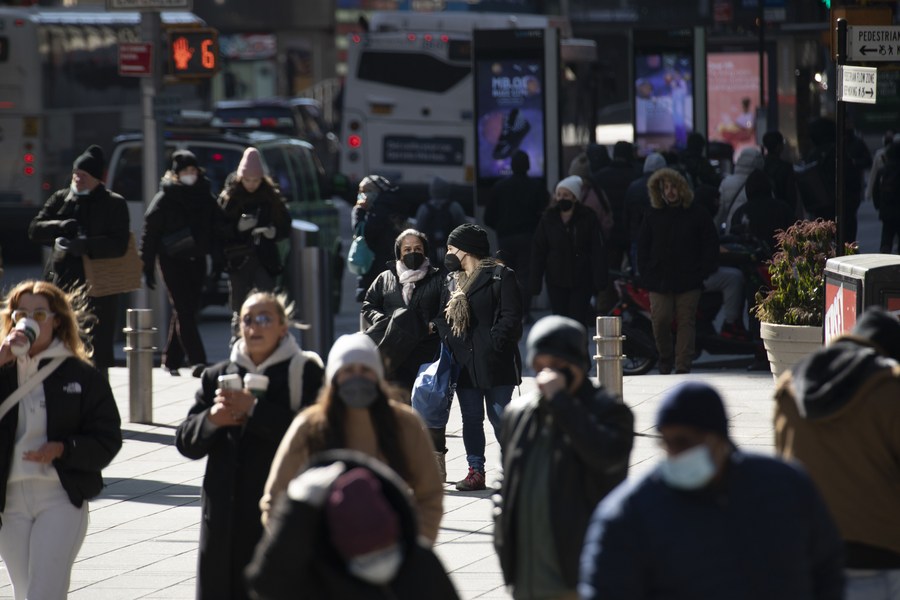 People walk on the street on Times Square in New York, the United States, Feb. 14, 2022. (Xinhua/Wang Ying)