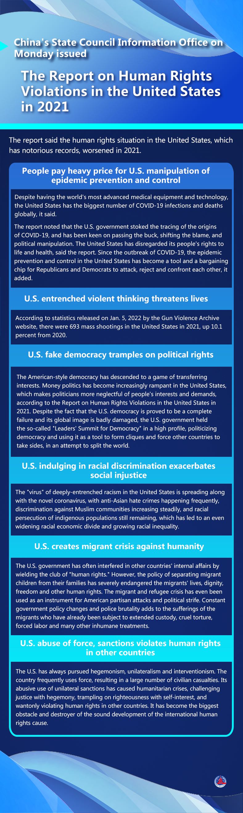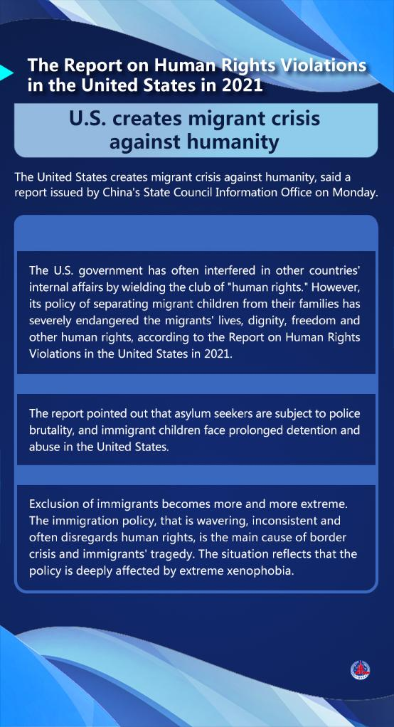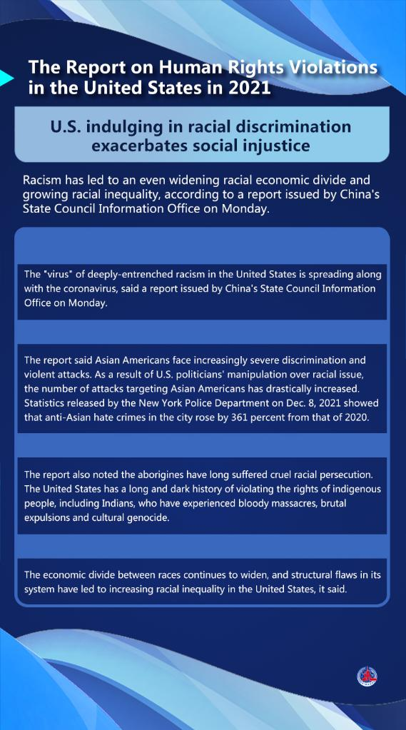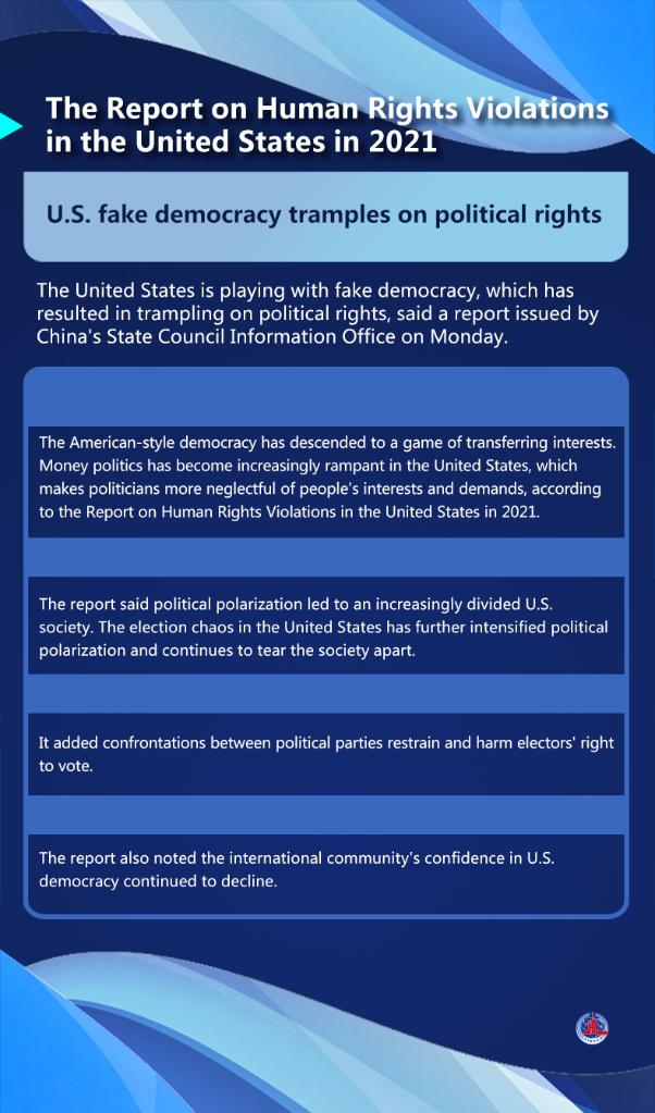 The report said the human rights situation in the United States, which has notorious records, worsened in 2021. Its political manipulation led to a sharp surge in COVID-19 deaths while shooting deaths in the country hit a new record.