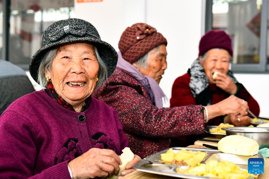 Elderly people enjoy their lunch at a care center for the elderly in Huangjiayu Village of Lanshan District, Rizhao, east China's Shandong Province, Feb. 27, 2022. Lanshan District of Rizhao City has set up care centers since 2021, providing assistance and care to the elderly people over 60 years old. (Xinhua/Guo Xulei)