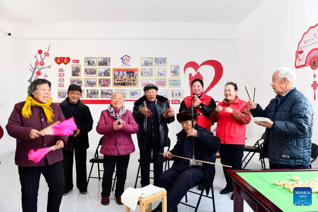 People enjoy themselves at a care center for the elderly in Huangjiayu Village of Lanshan District, Rizhao, east China's Shandong Province, Feb. 27, 2022. Lanshan District of Rizhao City has set up care centers since 2021, providing assistance and care to the elderly people over 60 years old. (Xinhua/Guo Xulei)