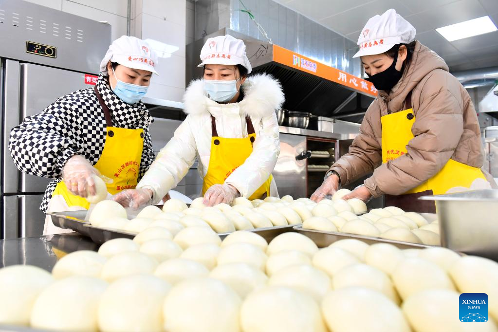 Volunteers prepare lunch at a community care center for the elderly in Lanshan District, Rizhao, east China's Shandong Province, Feb. 27, 2022. Lanshan District of Rizhao City has set up care centers since 2021, providing assistance and care to the elderly people over 60 years old. (Xinhua/Guo Xulei)