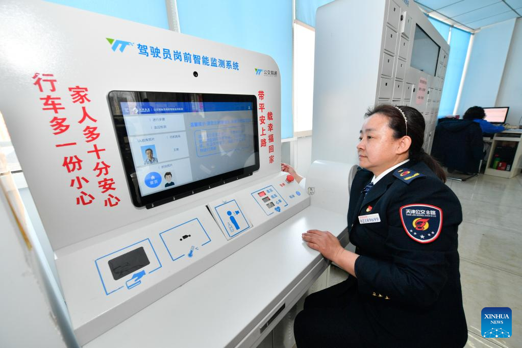 Wang Yan checks her blood pressure before starting her shift at a bus service office in north China's Tianjin, Feb. 24, 2022.
