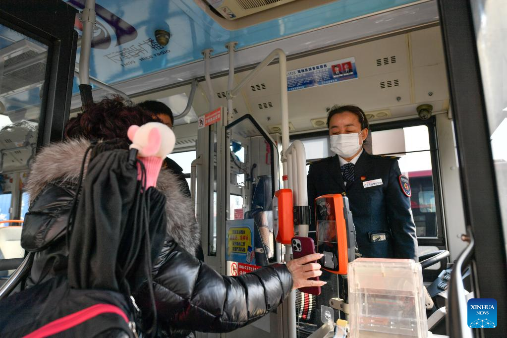 Wang Yan (R) checks a passenger's health code and body temperature aboard a bus in north China's Tianjin, Feb. 24, 2022.