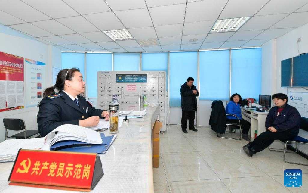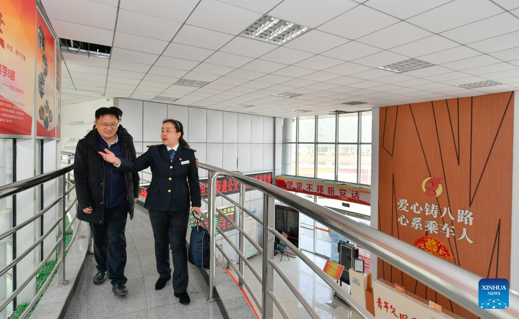 Wang Yan seeks suggestions on the application of charging piles in bus terminals from a representative of the State Grid Electric Vehicles Service's Tianjin branch at a bus service office in north China's Tianjin, Feb. 24, 2022.