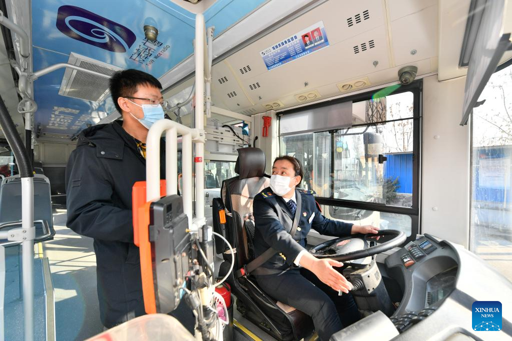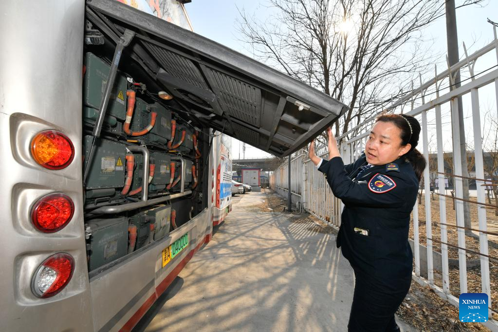 Wang Yan checks the batteries of her bus at a bus stop in north China's Tianjin, Feb. 24, 2022.