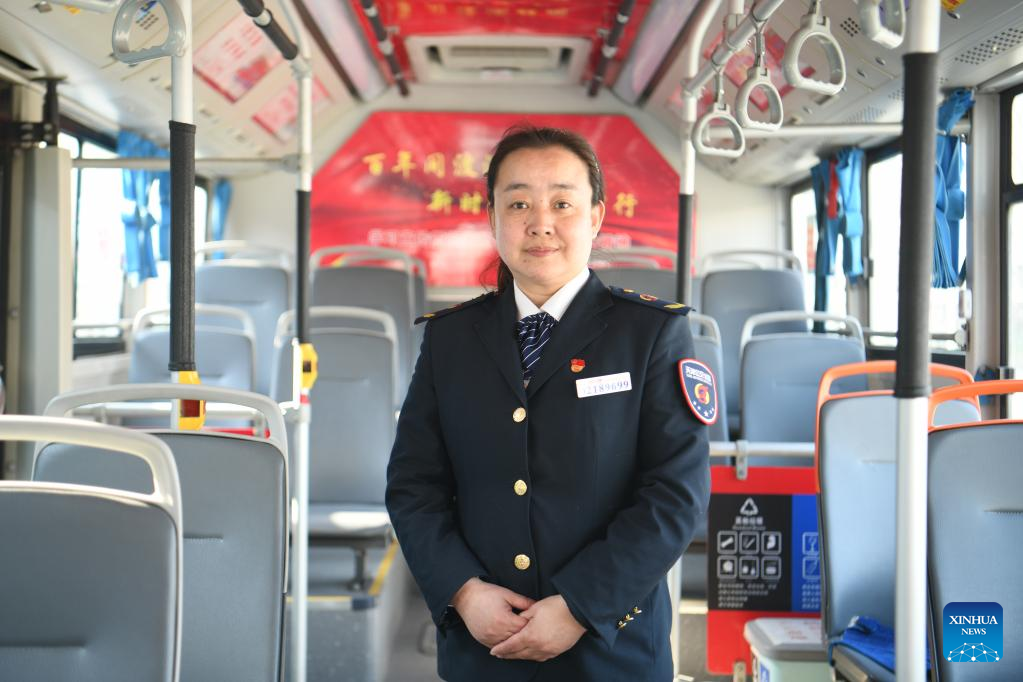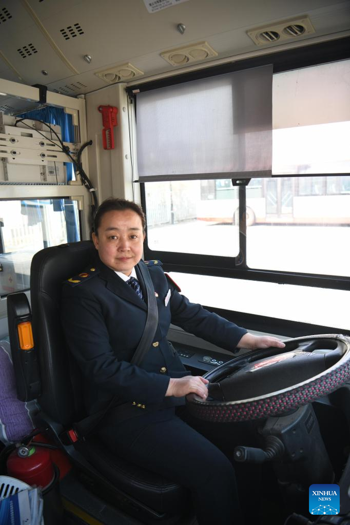 Wang Yan poses for a photo aboard a bus in north China's Tianjin, Feb. 24, 2022.