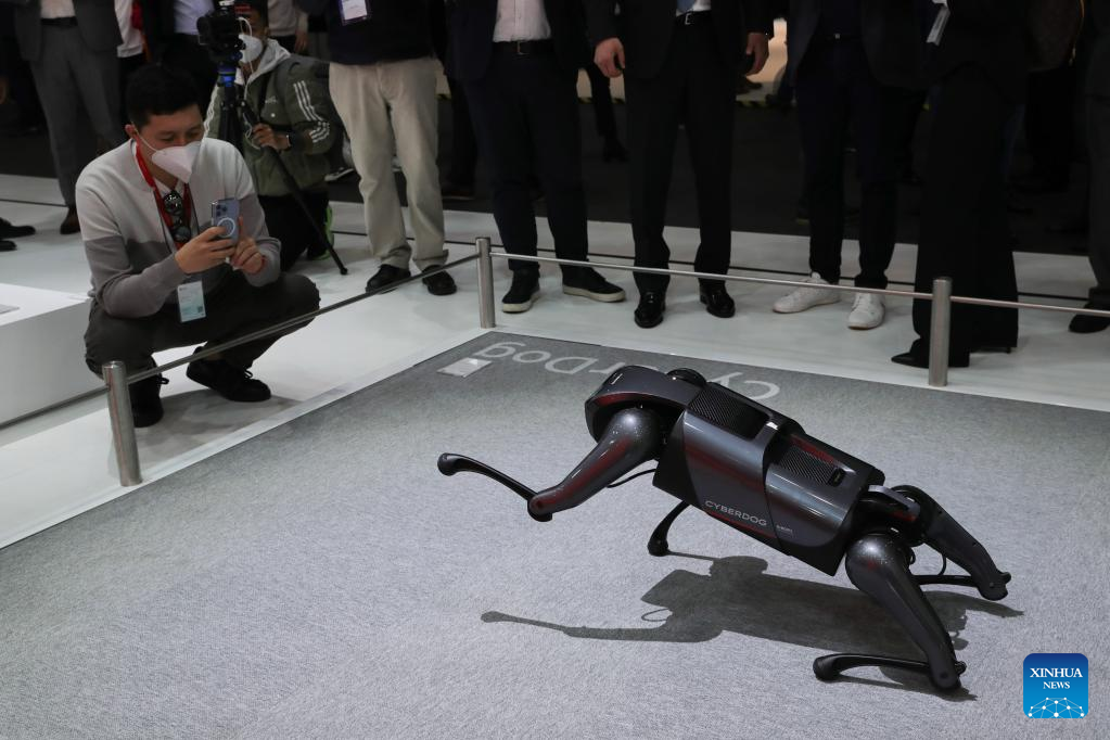 A man records a Xiaomi CyberDog during the Mobile World Congress in Barcelona, Spain, on Feb. 28, 2022. The 2022 edition of the Mobile World Congress opened its doors on Monday, for a four-day event that is expected to host between 40,000 and 60,000 people. (Xinhua/Zheng Huansong)