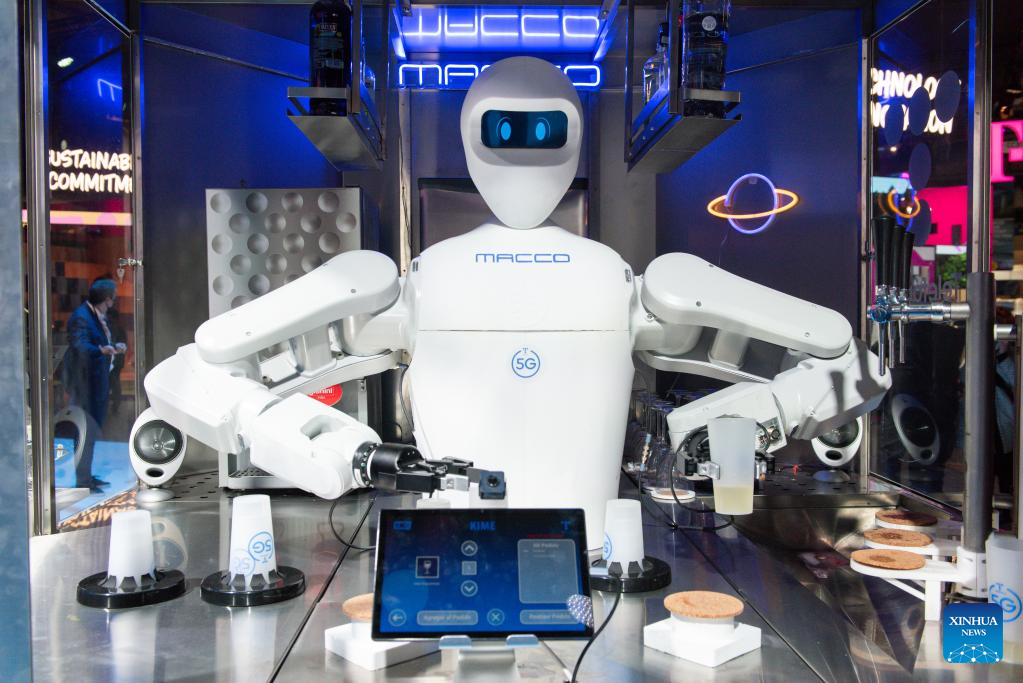 A robotic bartender supported by 5G technology serves beer during the Mobile World Congress in Barcelona, Spain, on Feb. 28, 2022. The 2022 edition of the Mobile World Congress opened its doors on Monday, for a four-day event that is expected to host between 40,000 and 60,000 people. (Photo by Gustavo Valiente/Xinhua)
