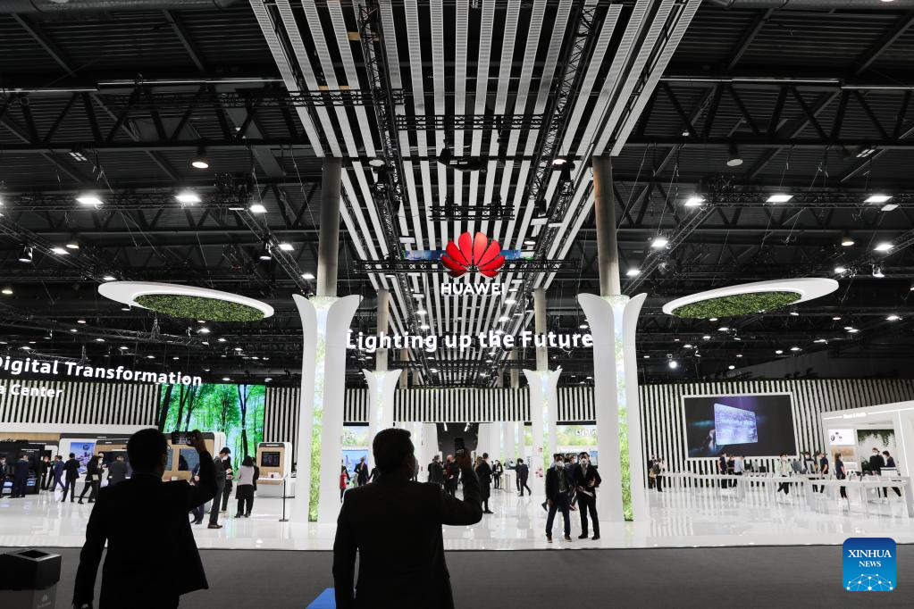 Visitors view the exhibition area of China's Huawei during the Mobile World Congress (MWC) in Barcelona, Spain, Feb. 28, 2022. The 2022 edition of the MWC is held from Feb. 28 to March 3. (Xinhua/Zheng Huansong)