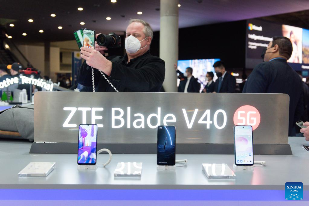 A visitor takes photos of ZTE's new cellphones during the Mobile World Congress in Barcelona, Spain, on Feb. 28, 2022. The 2022 edition of the Mobile World Congress opened its doors on Monday, for a four-day event that is expected to host between 40,000 and 60,000 people. (Photo by Gustavo Valiente/Xinhua)