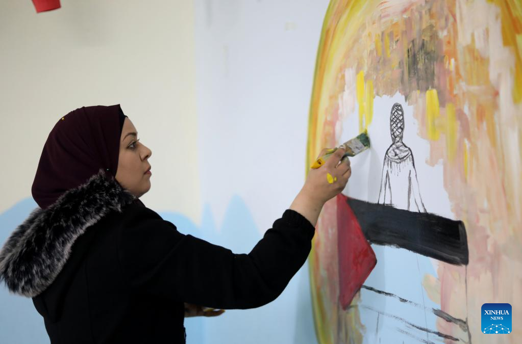 "I like to reflect the spirit of optimism and hope through my painting, to help people find strengths and happiness in their lives," she told Xinhua while painting a mural of a Palestinian woman in an embroidered dress standing in nature.