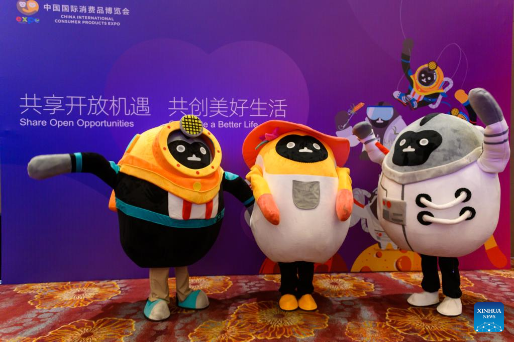 The mascots embody the three dominant and distinctive industries of Hainan, namely the seed industry, deep-sea industry and aerospace industry. Designers have endowed the mascots with diverse personalities, expecting that global enterprises and consumers can share opportunities and create a better life together through the expo, Tulenov said. (Xinhua/Hu Zhixuan)