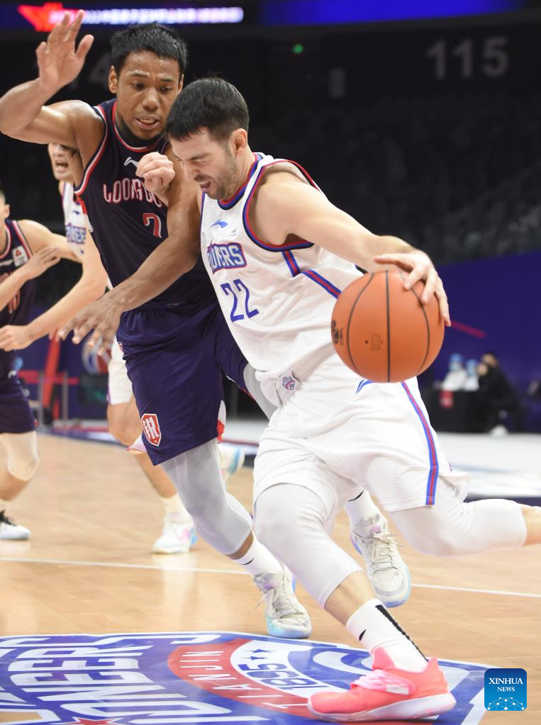 Taylor Rochestie (R) of Tianjin Pioneers competes during the 29th round match between Guangzhou Loong Lions and Tianjin Pioneers at the 2021-2022 season of the Chinese Basketball Association (CBA) league in Foshan of south China's Guangdong Province, on March 1, 2022. (Xinhua/Lu Hanxin)