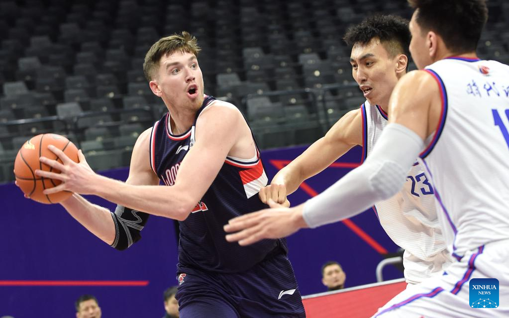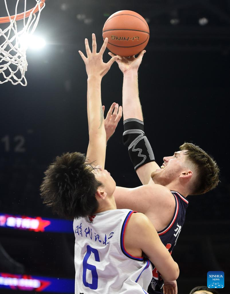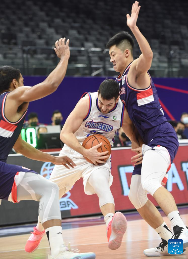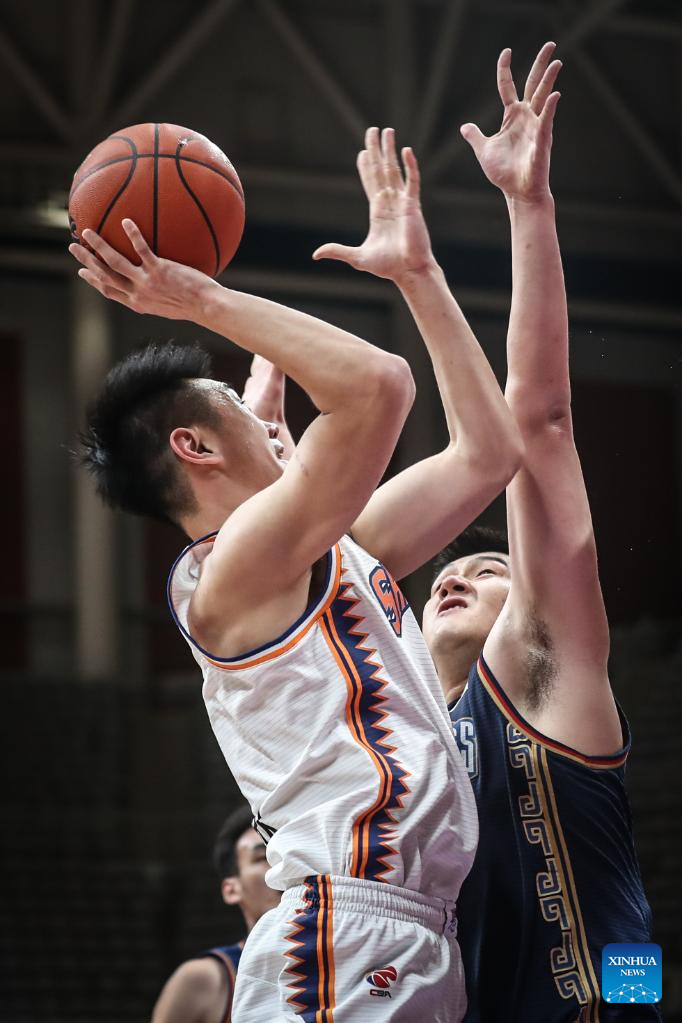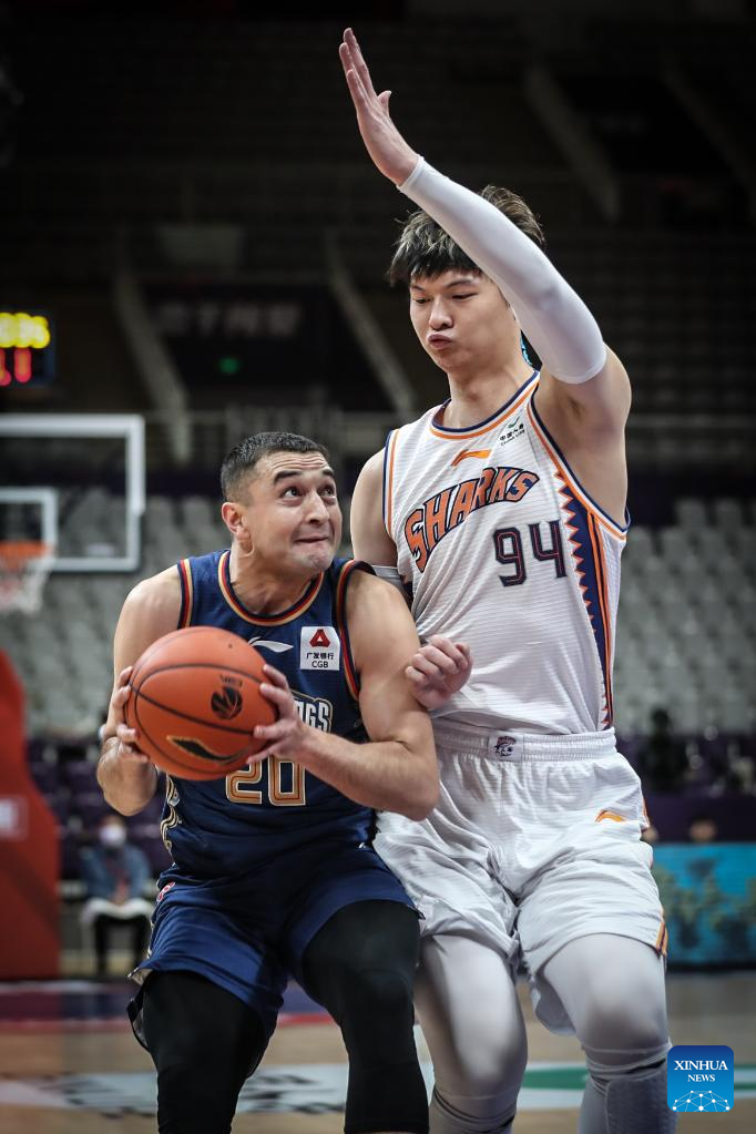 Zhu Mingzhen (R) of Guangzhou Loong Lions competes during the 29th round match between Guangzhou Loong Lions and Tianjin Pioneers at the 2021-2022 season of the Chinese Basketball Association (CBA) league in Foshan of south China's Guangdong Province, on March 1, 2022. (Xinhua/Lu Hanxin)