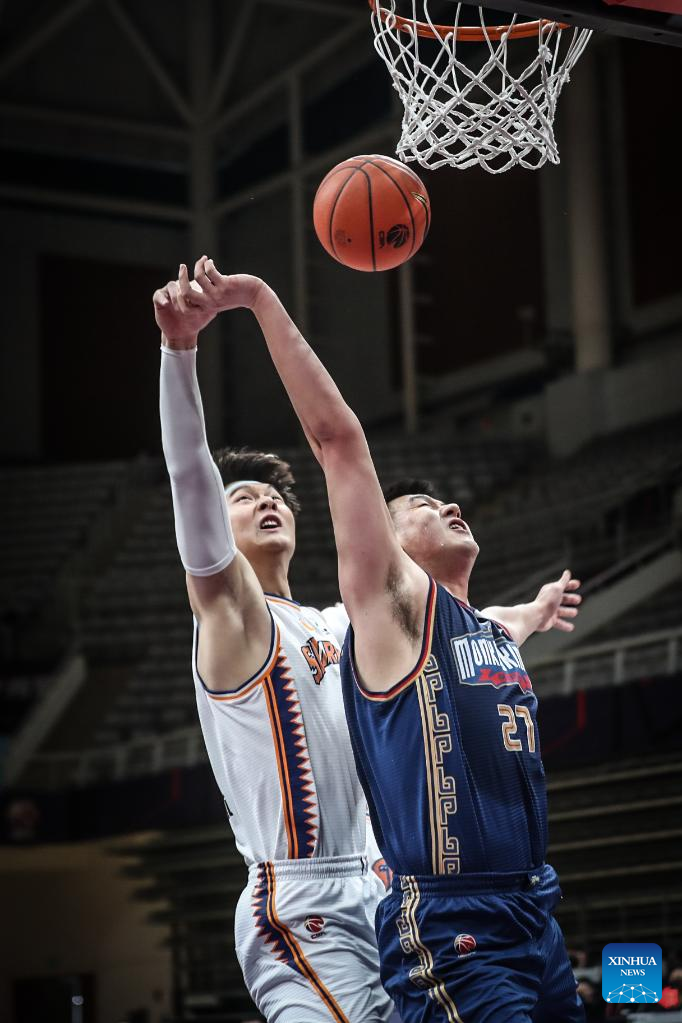 Li Tianrong (Front R) of Shanghai Sharks competes during the 29th round match between Shanghai Sharks and Nanjing Monkey Kings at the 2021-2022 season of the Chinese Basketball Association (CBA) league in Shenyang, capital of northeast China's Liaoning Province, on March 1, 2022. (Xinhua/Pan Yulong)