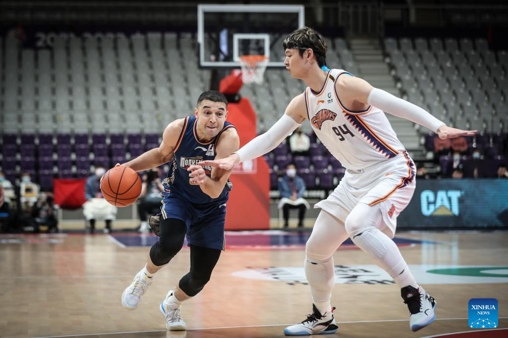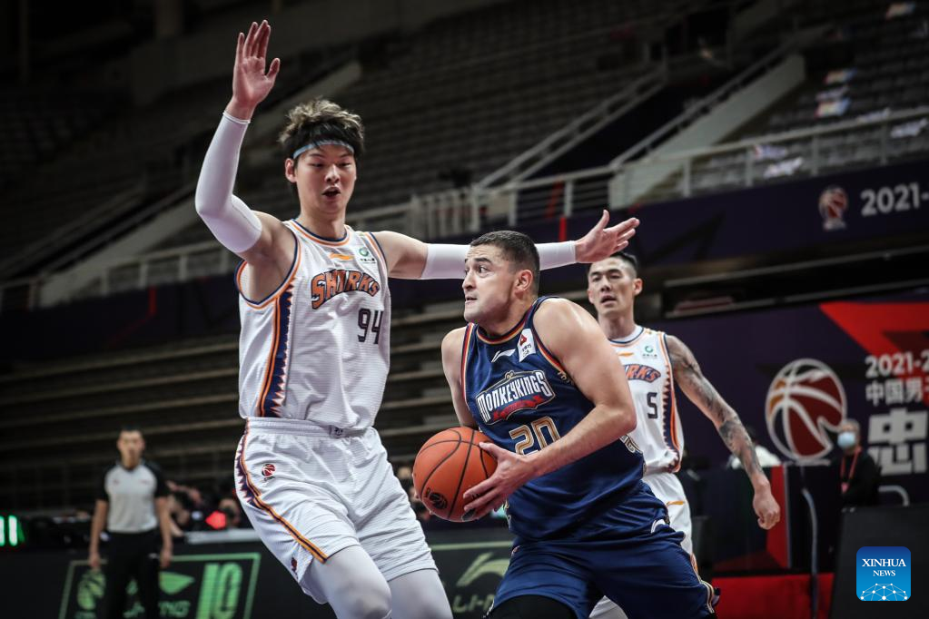 Xiralijan Muhtar (R) of Nanjing Monkey Kings breaks through under the defense of Wang Zhelin of Shanghai Sharks during the 29th round match between Shanghai Sharks and Nanjing Monkey Kings at the 2021-2022 season of the Chinese Basketball Association (CBA) league in Shenyang, capital of northeast China's Liaoning Province, on March 1, 2022. (Xinhua/Pan Yulong)