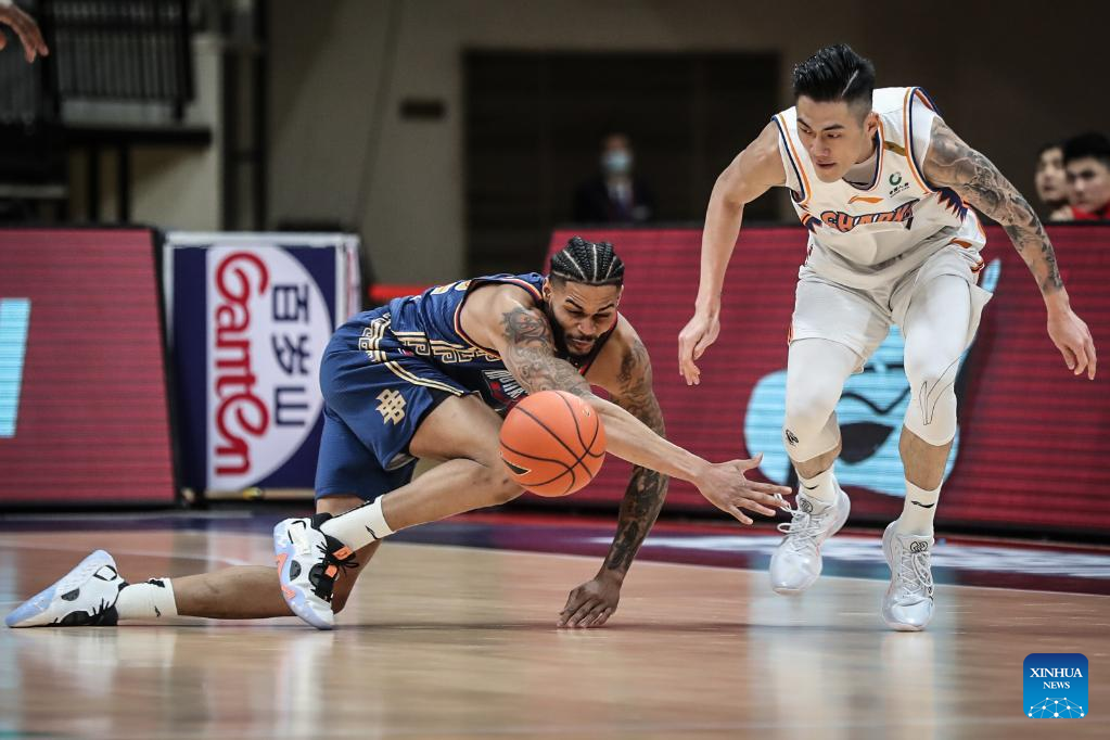 Ty Jacob Leaf (L) of Guangzhou Loong Lions competes during the 29th round match between Guangzhou Loong Lions and Tianjin Pioneers at the 2021-2022 season of the Chinese Basketball Association (CBA) league in Foshan of south China's Guangdong Province, on March 1, 2022. (Xinhua/Lu Hanxin)