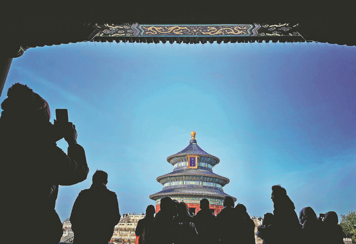 Visitors to the Temple of Heaven in Beijing enjoy a clear sky in November. Municipal authorities have announced a comprehensive success in improving the city's air quality. [Photo by Du Lianyi/China Daily]