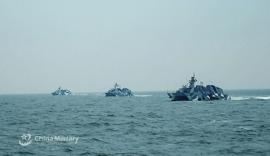 Fast attack missile boats attached to a group with the navy under the PLA Eastern Theater Command steam in formation during a maritime training exercise in waters of the East China Sea on February 22, 2022. (eng.chinamil.com.cn/Photo by Du Kecheng)