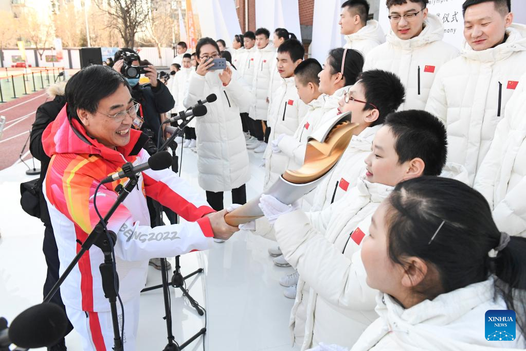 A student of Beijing School For The Blind touches the torch during the Beijing 2022 Paralymic Torch Relay and Flame Lighting Ceremony at Beijing School For The Blind in Beijing, capital of China, March 2, 2022.