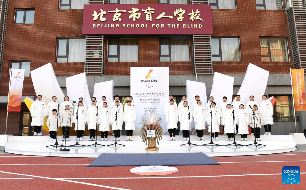 The flame is lit as students and teachers of Beijing School For The Blind sing a song during the Beijing 2022 Paralymic Torch Relay and Flame Lighting Ceremony at Beijing School For The Blind in Beijing, capital of China, March 2, 2022.