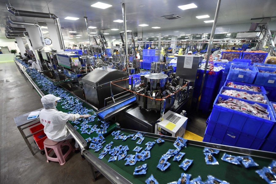 Workers are busy at the production line of Luosifen rice noodles at a food-processing company in Liuzhou City, south China's Guangxi Zhuang Autonomous Region, June 17, 2021. (Xinhua/Huang Xiaobang)