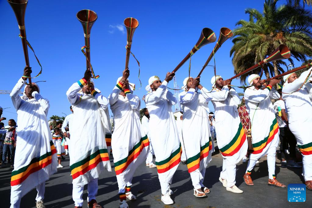 People perform during a celebration for the Victory Day in Addis Ababa, Ethiopia, on March 2, 2022. Ethiopians on Wednesday celebrated the 126th anniversary of Ethiopia's victory of Adwa, which marked the East African country's victory against a colonial power some 126 years ago. (Xinhua)