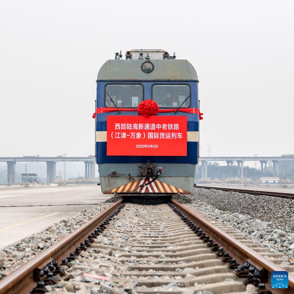 CHONGQING, March 2 (Xinhua) -- Carrying 37 twenty-foot equivalent units (TEU) of goods worth over 4 million yuan (630,000 U.S. dollars), the first cargo train departed Xiaonanya station in Jiangjin District, southwest China's Chongqing Municipality, for Vientiane Wednesday.