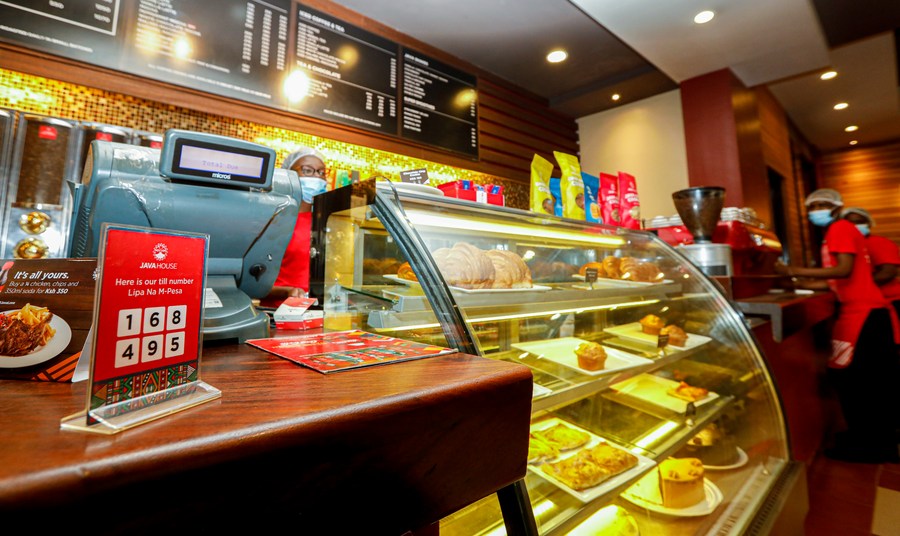 M-pesa payment information is displayed at the checkout counter of a coffee shop in Nairobi, capital of Kenya, Sept. 16, 2021. (Xinhua/Zhang Yu)