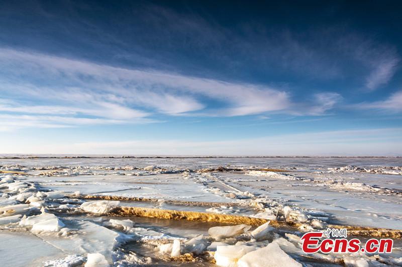 Sunset scenery over the frozen Qinghai Lake, China's largest inland salt lake, at Erlangjian scenic area, northwest China's Qinghai Province. (Photo: China New Service/Zhao Haimei)