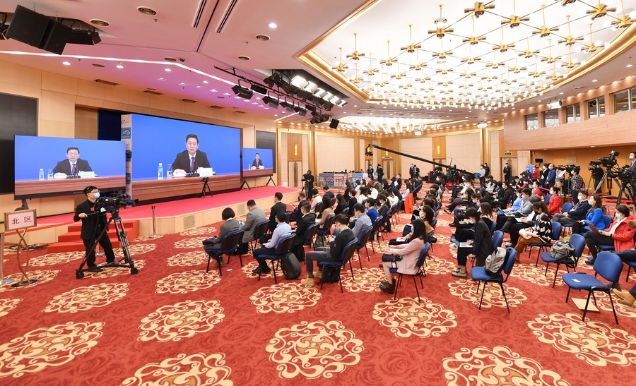 Journalists attend a press conference of the fifth session of the 13th National Committee of the Chinese People's Political Consultative Conference (CPPCC) via video link in Beijing, capital of China, March 3, 2022. (Xinhua/Li Xin)