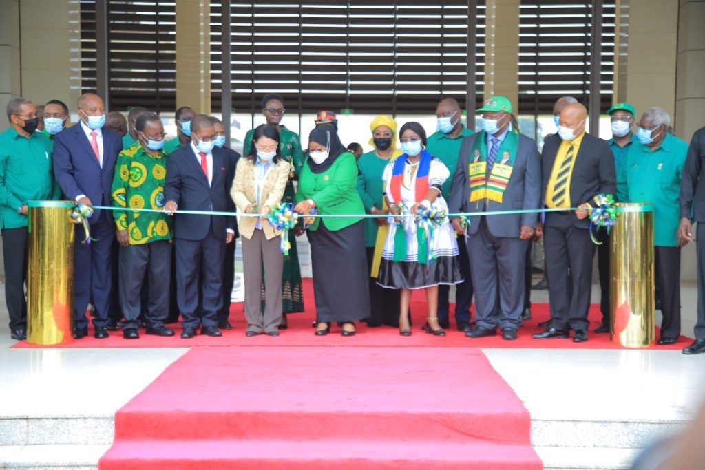 Chinese Ambassador to Tanzania Chen Mingjian, President of Chama Cha Mapinduzi Party and Tanzanian President Samia Suluhu Hassan, as well as general secretaries and high-level representatives of the other five parties cut the ribbon at the inauguration ceremony of the Mwalimu Julius Nyerere Leadership School. (Photo from https://panafricanvisions.com/)
