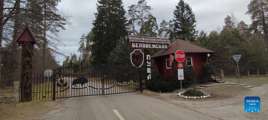 Photo taken on March 2, 2022 shows an entrance of the Belovezhskaya forest nature reserve in the border area between Belarus and Poland. The second round of talks between Russian and Ukrainian delegations has started, Russia's Sputnik reported Thursday. (Xinhua/Zhang Jiye)