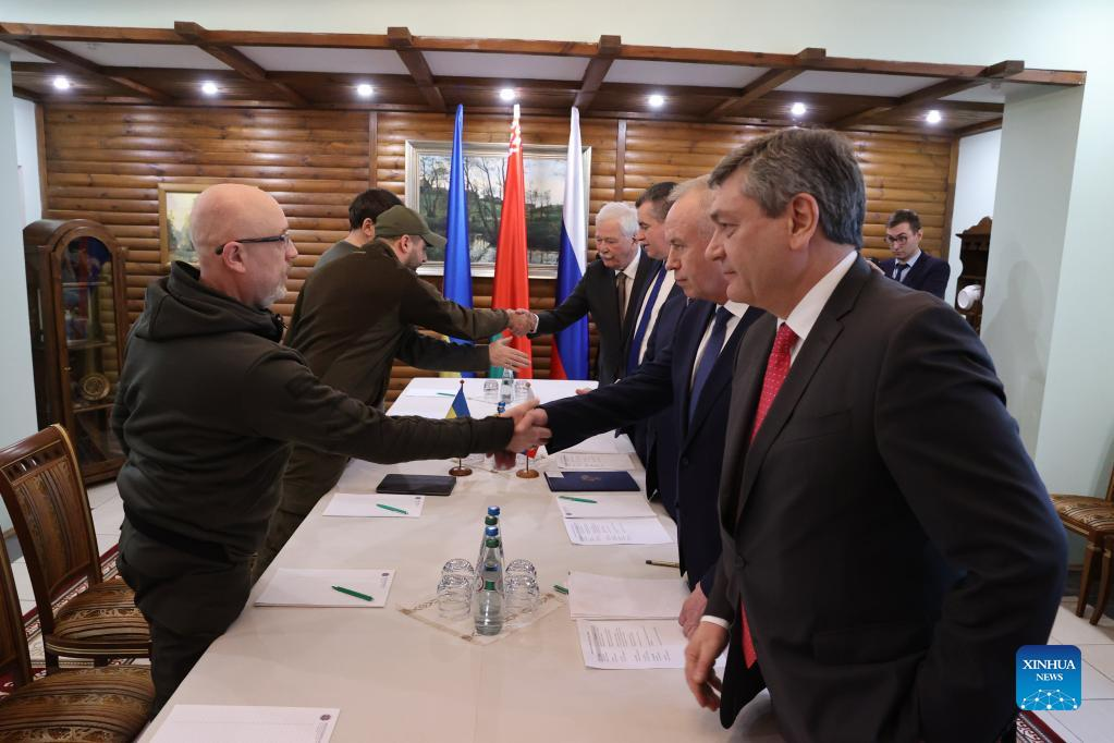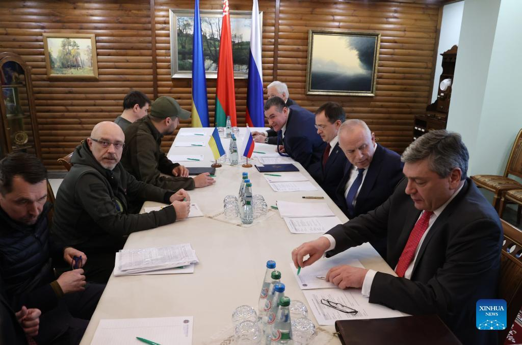 Photo taken on March 3, 2022 shows a view of the second round of talks between Russian and Ukrainian delegations at the Belovezhskaya Pushcha on the Belarus-Poland border. The second round of talks between Russian and Ukrainian delegations has started, Russia's Sputnik reported Thursday. (Belta news agency via Xinhua)