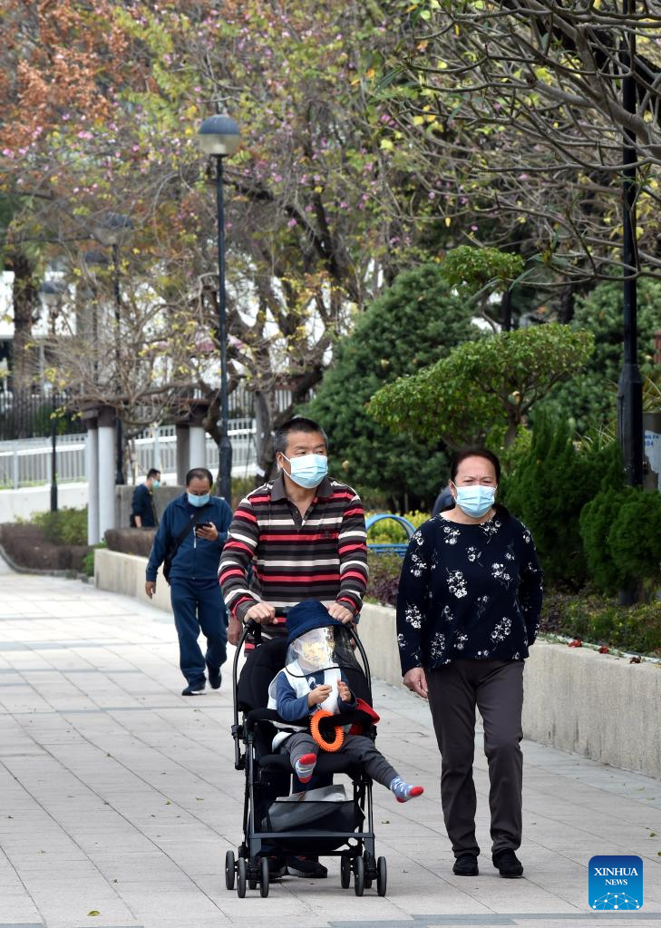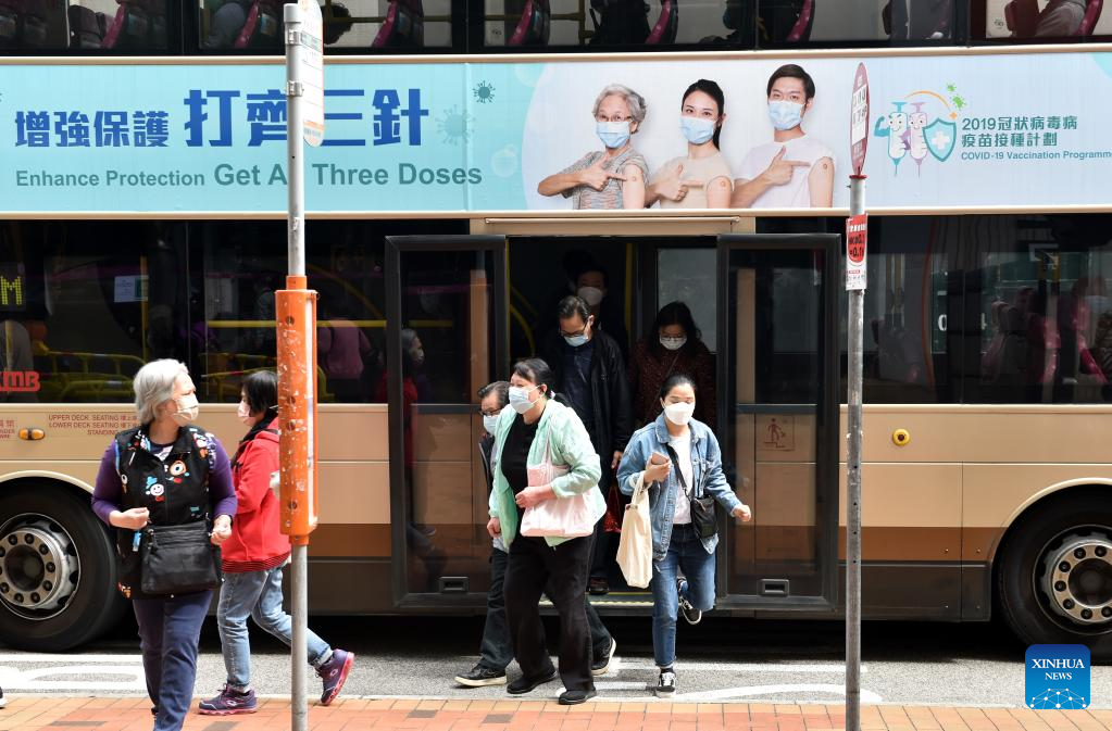 People wearing face masks walk in Tsuen Wan, south China's Hong Kong, March 3, 2022. On Thursday, the government of the Hong Kong Special Administrative Region (HKSAR) reported 56,827 new COVID-19 cases, another record high, with 144 more deaths, official data showed. (Xinhua/Lo Ping Fai)