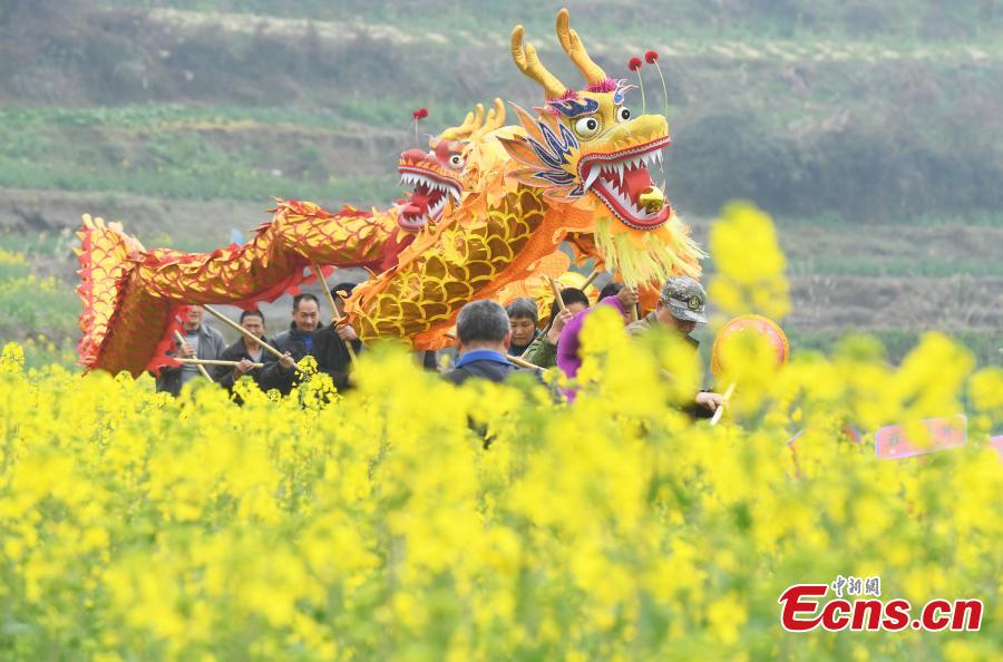 Villagers perform dragon dance in a field of cole flowers at Fuling, Chongqing to celebrate the Longtaitou Festival, March 3, 2022. The traditional Chinese Longtaitou Festival, or Dragon-Head-Raising Festival, falls on the second day of the second lunar month every year, marking the start of farming. (Photo: China News Service/Chen Chao)