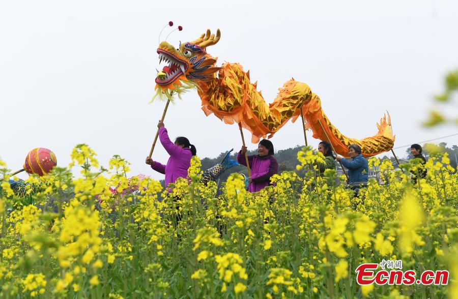 Villagers perform dragon dance in a field of cole flowers at Fuling, Chongqing to celebrate the Longtaitou Festival, March 3, 2022. The traditional Chinese Longtaitou Festival, or Dragon-Head-Raising Festival, falls on the second day of the second lunar month every year, marking the start of farming. (Photo: China News Service/Chen Chao)