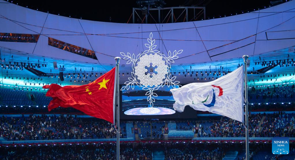 The National Flag of the People's Republic of China is raised during the opening ceremony of the Beijing 2022 Paralympic Winter Games at the National Stadium in Beijing, capital of China, March 4, 2022. (Xinhua/Zhang Keren)
