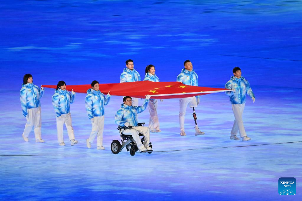 The National Flag of the People's Republic of China is carried during the opening ceremony of the Beijing 2022 Paralympic Winter Games at the National Stadium in Beijing, capital of China, March 4, 2022. (Xinhua/Ren Chao)