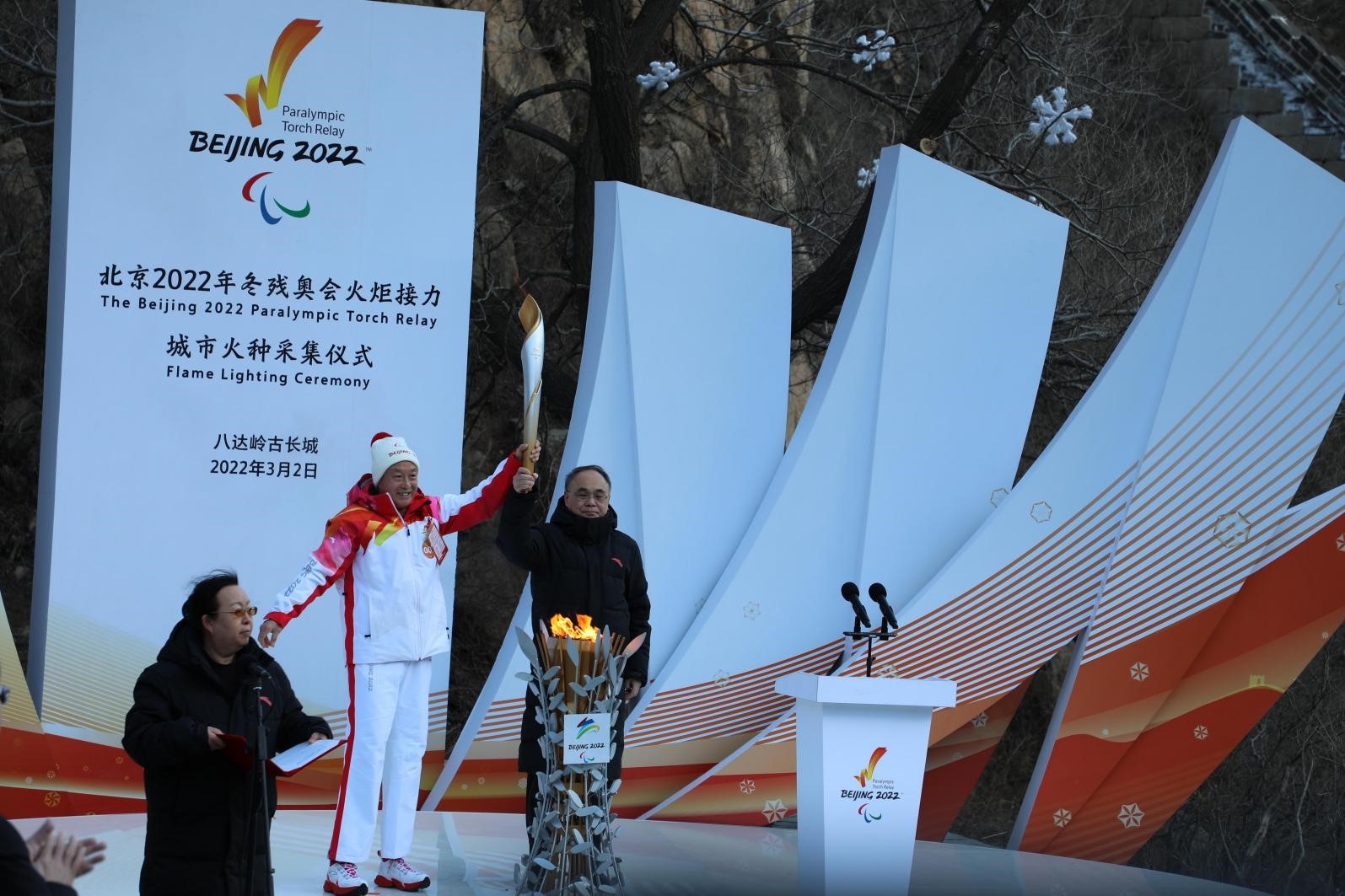 Xia Boyu (middle), a member of the Chinese Mountaineering Association and also the first mutilated athlete to conquer Mount Qomolangma, becomes the first torchbearer at the Beijing 2022 Paralympic Winter Games flame lighting ceremony at the Badaling section of the Great Wall in Beijing, March. 2, 2022. (Photo by Wan Yu/People’s Daily Online)