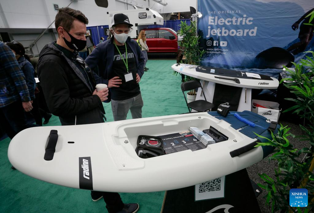 People look at a electric powered surfboard at the Vancouver Outdoor Adventure and Travel Show in Vancouver, British Columbia, Canada, on March 5, 2022. The two-day event, which runs on March 5th and 6th, features the latest outdoor gear and information of adventure travel ideas. (Photo by Liang Sen/Xinhua)