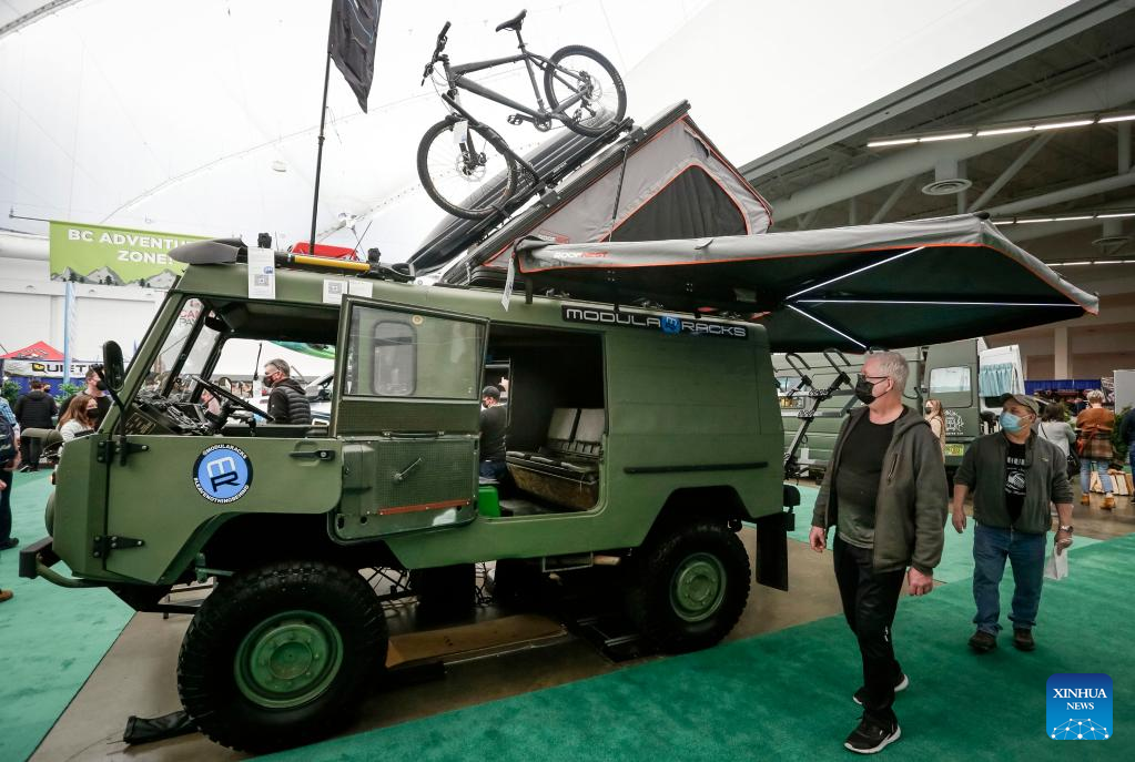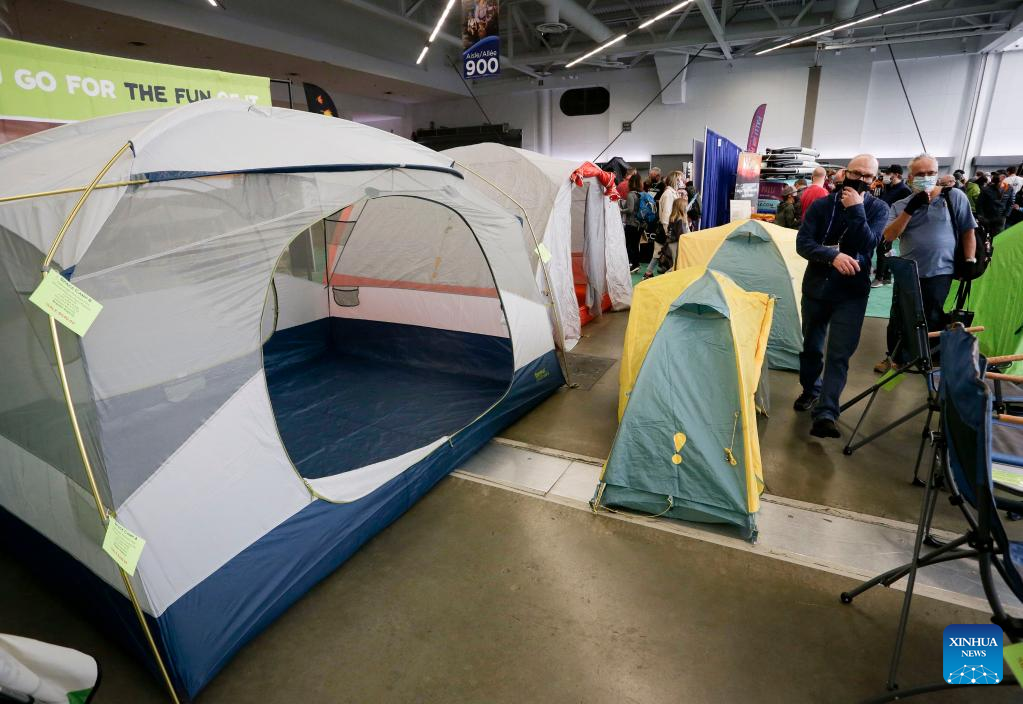 People look at camping tents at the Vancouver Outdoor Adventure and Travel Show in Vancouver, British Columbia, Canada, on March 5, 2022. The two-day event, which runs on March 5th and 6th, features the latest outdoor gear and information of adventure travel ideas. (Photo by Liang Sen/Xinhua)