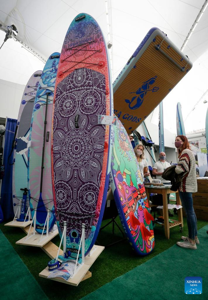 Inflatable paddleboards are displayed at the Vancouver Outdoor Adventure and Travel Show in Vancouver, British Columbia, Canada, on March 5, 2022. The two-day event, which runs on March 5th and 6th, features the latest outdoor gear and information of adventure travel ideas. (Photo by Liang Sen/Xinhua)