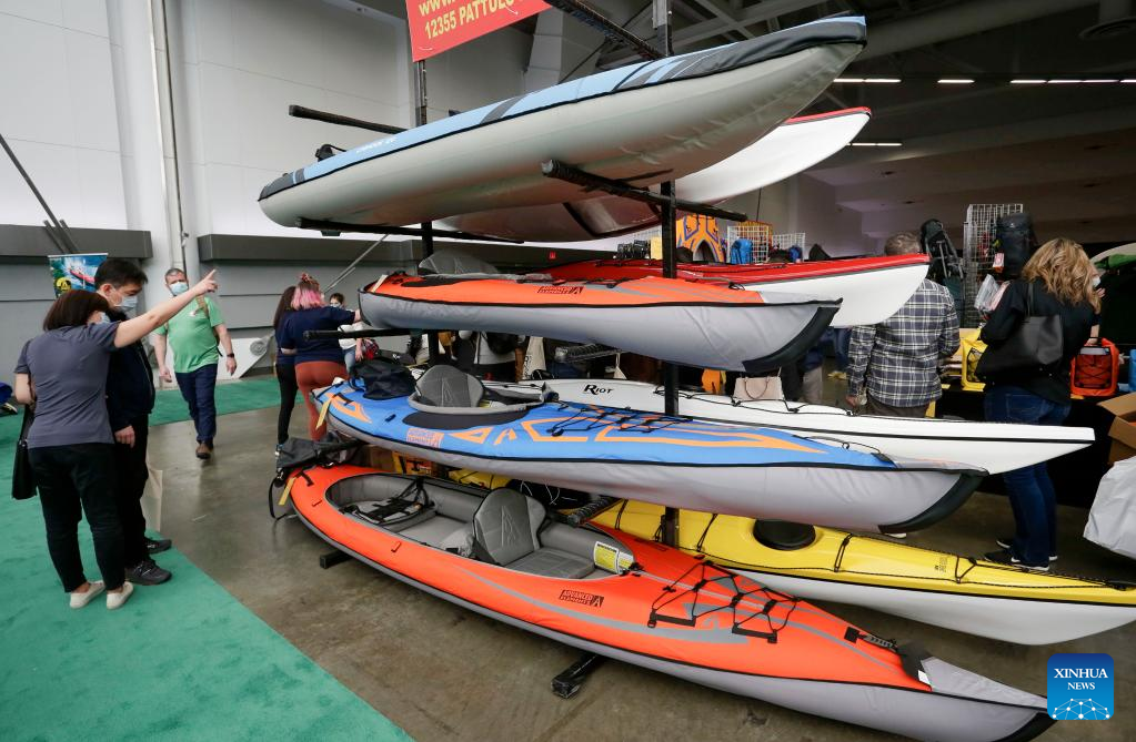People look at kayaks at the Vancouver Outdoor Adventure and Travel Show in Vancouver, British Columbia, Canada, on March 5, 2022. The two-day event, which runs on March 5th and 6th, features the latest outdoor gear and information of adventure travel ideas. (Photo by Liang Sen/Xinhua)