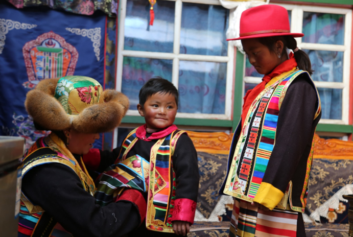 Tibetan children wear traditional Tibetan costumes to celebrate the Tibetan New Year in a village in Gyaimain township, Qonggyai county, Lhoka, southwest China’s Tibet autonomous region. (Photo from Tibet.cn)