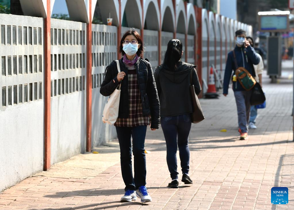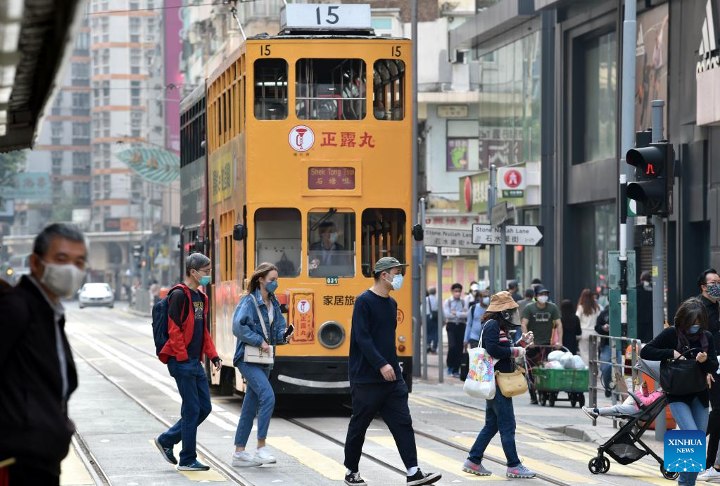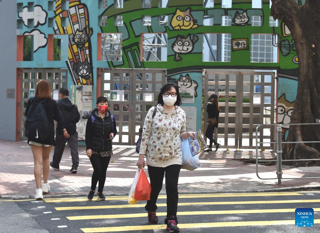 People wearing face masks walk on a street in south China's Hong Kong, March 5, 2022. The Hong Kong Special Administrative Region (HKSAR) reported 37,529 new COVID-19 cases and 150 deaths on Saturday, official data showed. (Xinhua/Lo Ping Fai)
