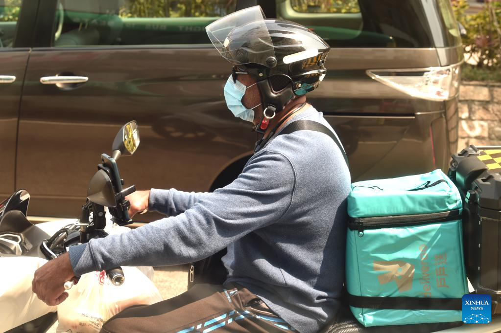 A deliveryman wearing a face mask rides on a street in south China's Hong Kong, March 5, 2022. The Hong Kong Special Administrative Region (HKSAR) reported 37,529 new COVID-19 cases and 150 deaths on Saturday, official data showed. (Xinhua/Lo Ping Fai)