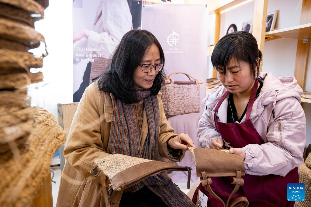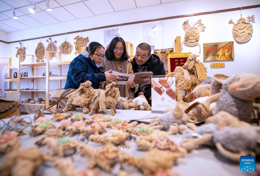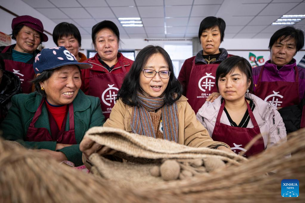 Zhang Jing (C front) checks the hemp weaving products made by the villagers in Yueyahu Township, Yinchuan, capital of northwest China's Ningxia Hui Autonomous Region, March 4, 2022. Zhang Jing, an inheritor of intangible cultural heritage of hemp weaving, came to Yueyahu Township at the end of 2017, and set up a training class and a hemp weaving workshop here. Most of the trainees are women, with the youngest 26 years old and the oldest over 70.