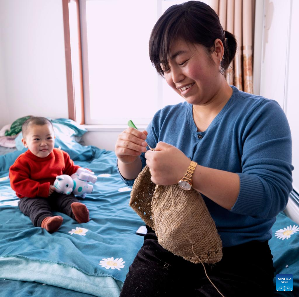 A villager weaves a hemp bag in Yueyahu Township, Yinchuan, capital of northwest China's Ningxia Hui Autonomous Region, March 4, 2022. Zhang Jing, an inheritor of intangible cultural heritage of hemp weaving, came to Yueyahu Township at the end of 2017, and set up a training class and a hemp weaving workshop here. Most of the trainees are women, with the youngest 26 years old and the oldest over 70.