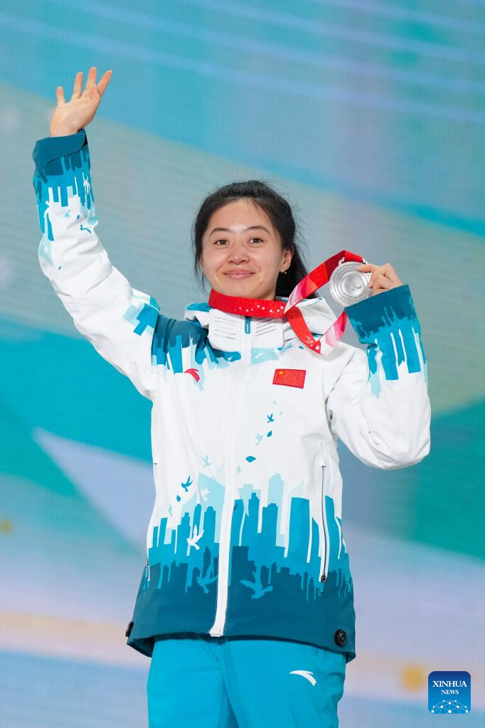 Silver medalist Shan Yilin poses for a photo during the awarding ceremony of Para Biathlon Women's Sprint Sitting of Beijing 2022 Paralympic Winter Games at Zhangjiakou Medals Plaza in Zhangjiakou, north China's Hebei Province, March 6, 2022. (Xinhua/Peng Ziyang)
